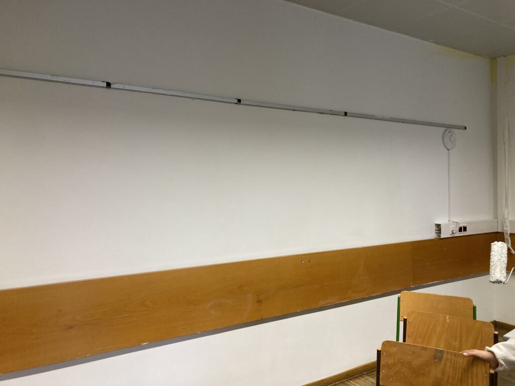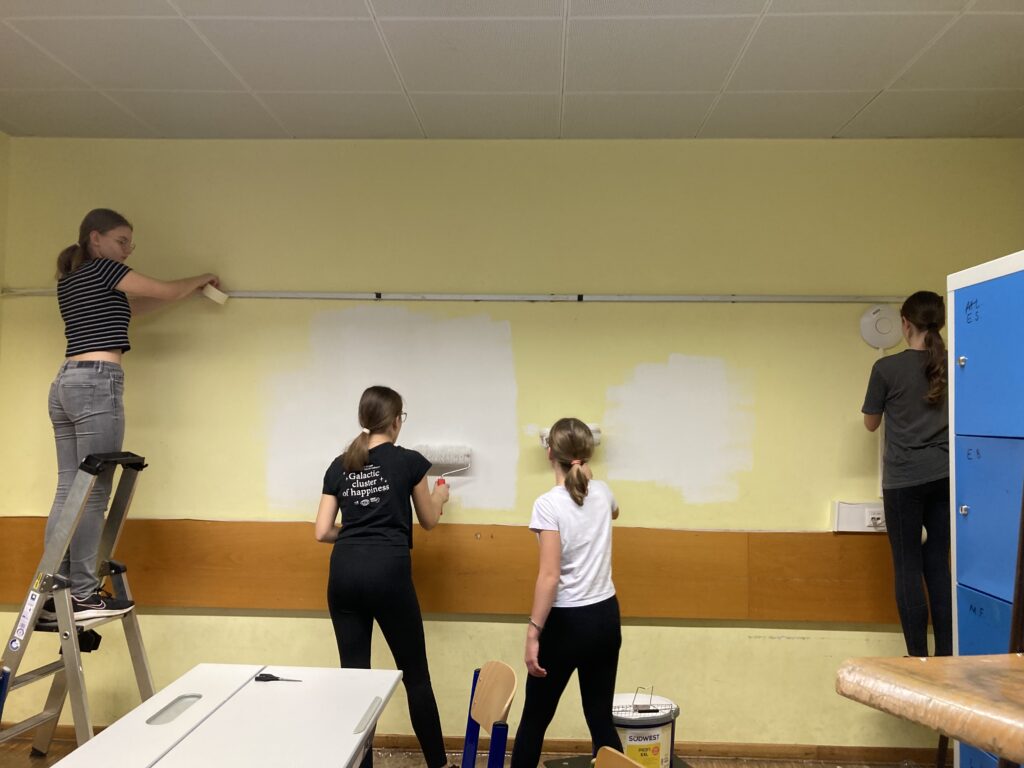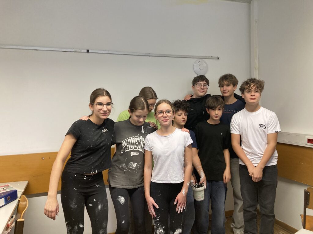 Einige Schülerinnen und Schüler der 4B wünschten sich ein neues Raumdesign ihrer Stammklasse, welches sie am 14.11.25 in den ersten drei Stunden entschlossen umgesetzt haben. Die Farbe dafür stellte die Schule zur Verfügung (inkl. Zubehör).