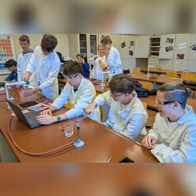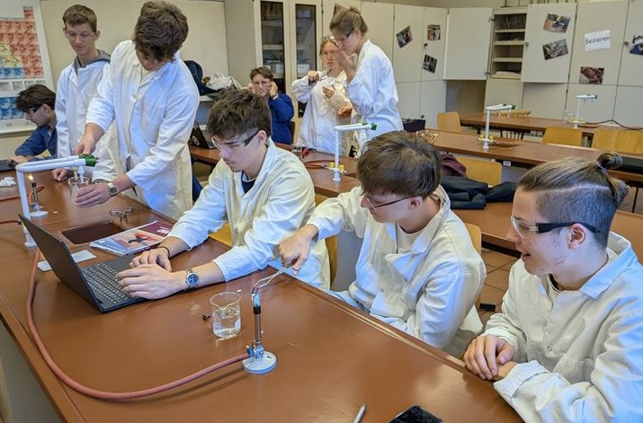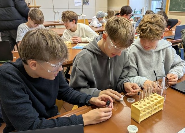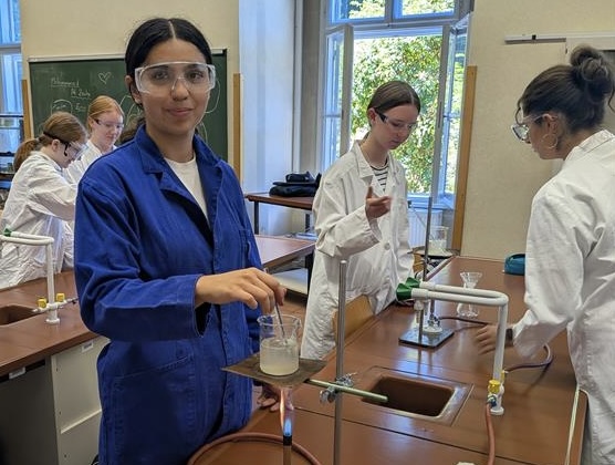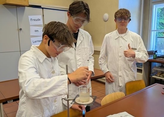 Im Chemieunterricht dürfen unsere Schüler*innen selbst aktiv werden. Durch das Ausführen von Experimenten im Team lernen sie chemische Vorgänge kennen, beobachten Reaktionen und entwickeln ein erstes Verständnis für wissenschaftliches Arbeiten. So werden nicht nur Fachwissen und Methodenkompetenz gestärkt, sondern auch Zusammenarbeit und Verantwortung. Sie erleben, wie spannend Naturwissenschaft sein kann und wie viel Freude es macht, Phänomene aus dem Alltag zu erforschen.